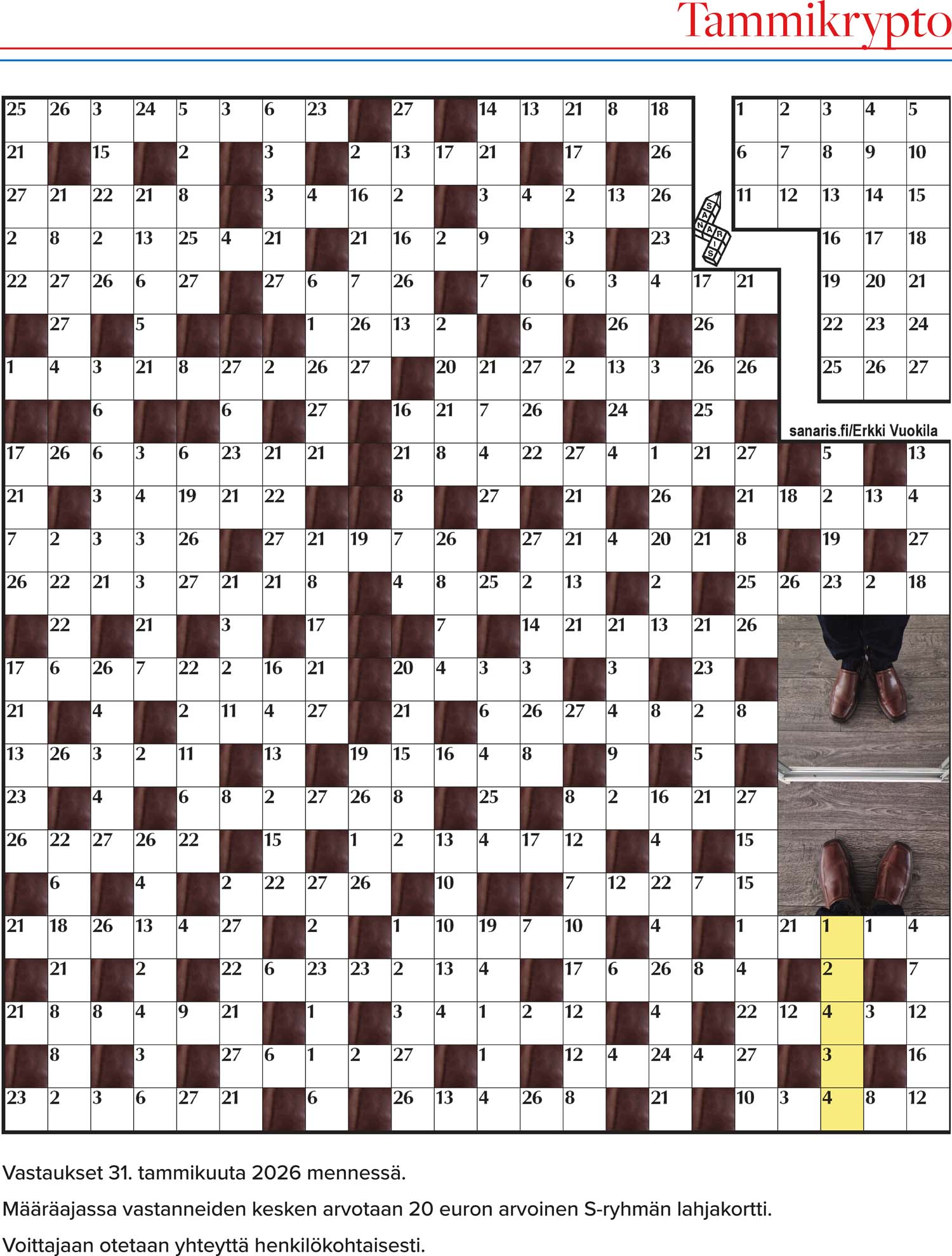 Taloustaito 1/26Tyyppi: kryptoVaikeustaso: helppo/kesk. Laatija: Erkki Vuokila Piirtäjä: Erkki Vuokila |