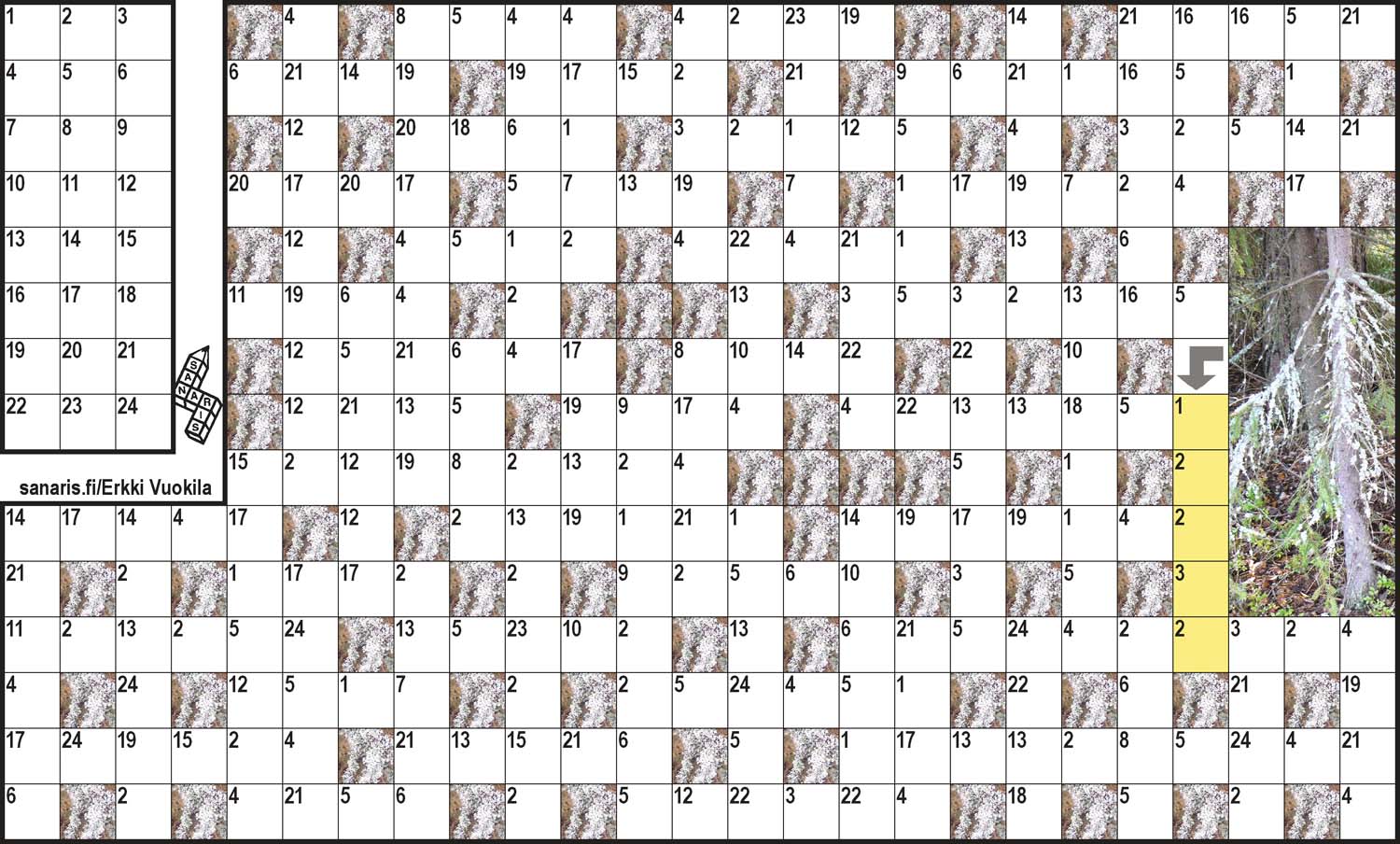 Metsälehti 3/26Tyyppi: kryptoVaikeustaso: helppo/kesk. Laatija: Erkki Vuokila Piirtäjä: Erkki Vuokila |