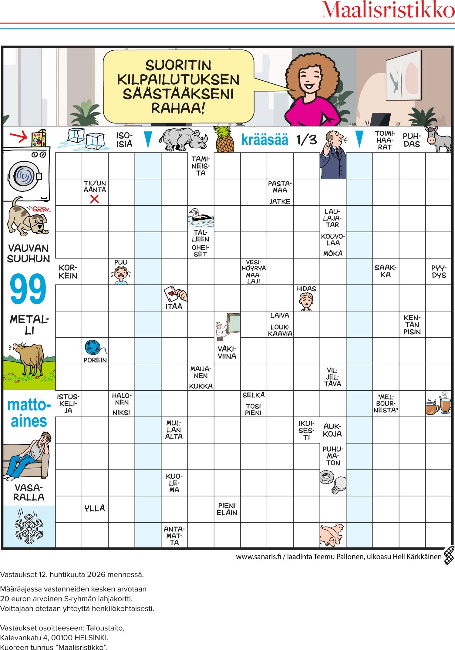 Taloustaito 2/26Tyyppi: ristikkoVaikeustaso: helppo/kesk. Laatija: Teemu Pallonen Piirtäjä: Heli Kärkkäinen |
