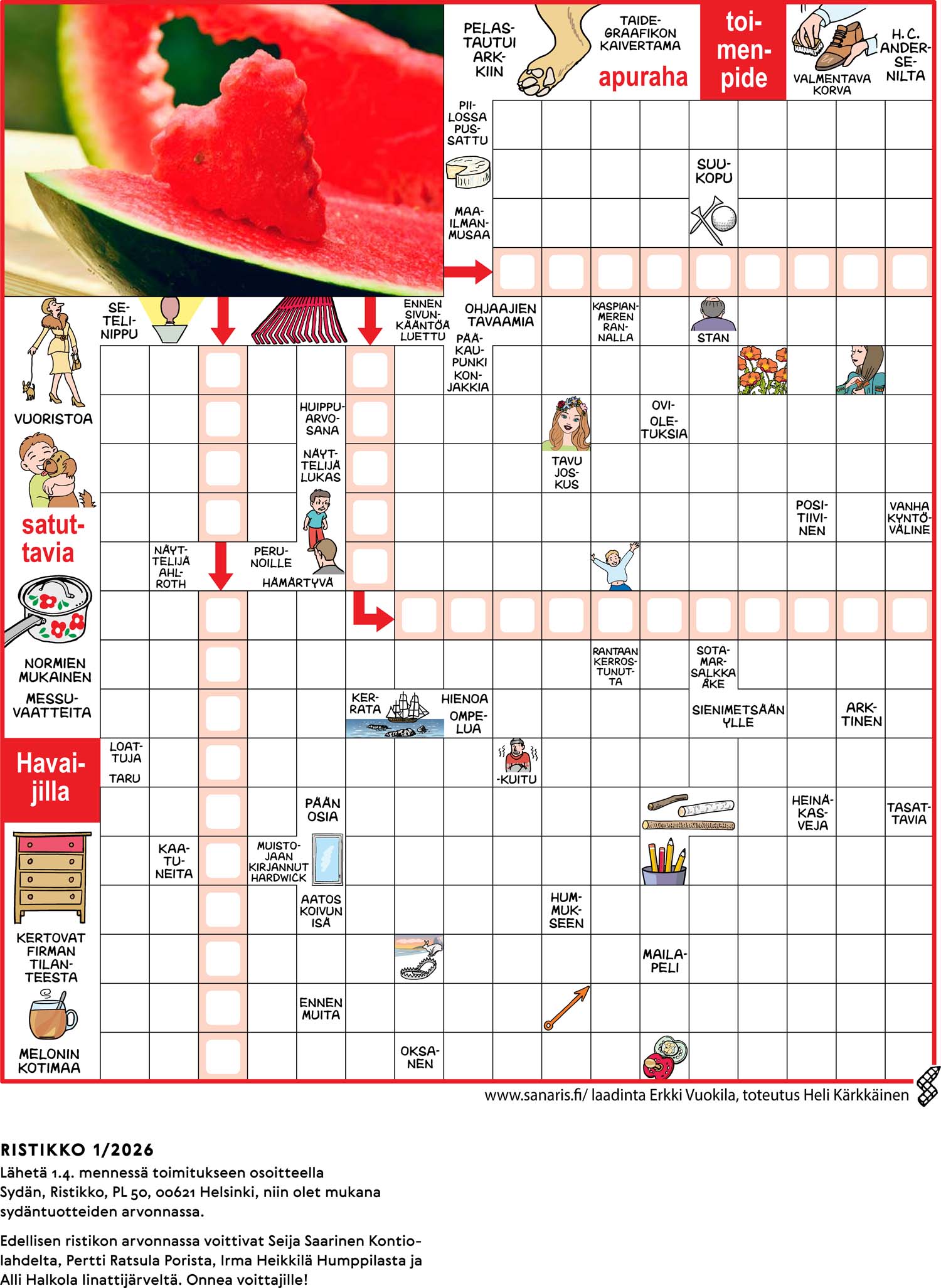 Sydän 1/26Tyyppi: ristikkoVaikeustaso: helppo/kesk. Laatija: Erkki Vuokila Piirtäjä: Heli Kärkkäinen |
